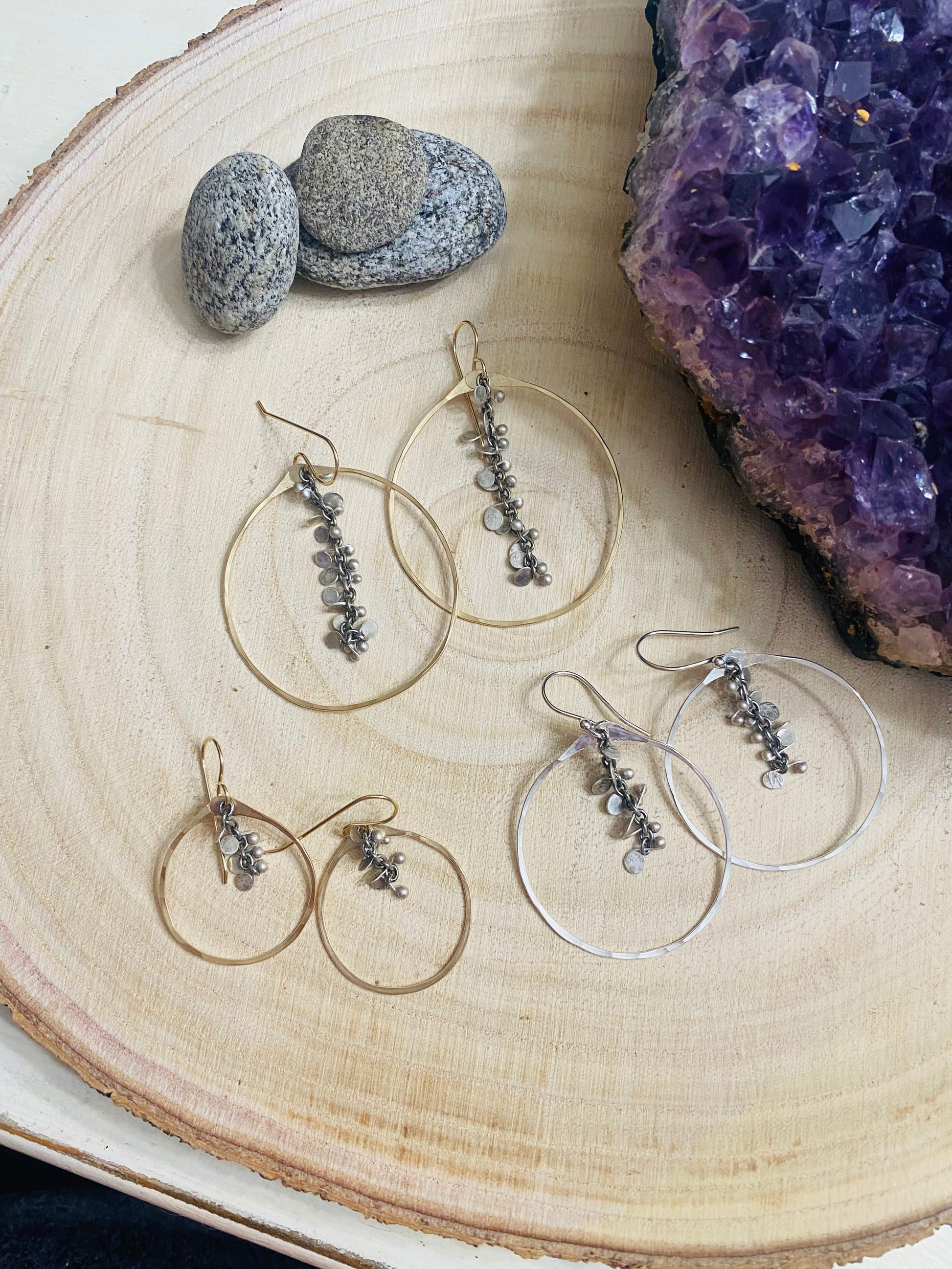 One of our all time best-sellers! These beautiful hoops feature a trail of hand-hammered fine silver paillettes which look like pure silver confetti playfully cascading down. Lots of intricate metal work here and such a signature look for your jewelry collection.
