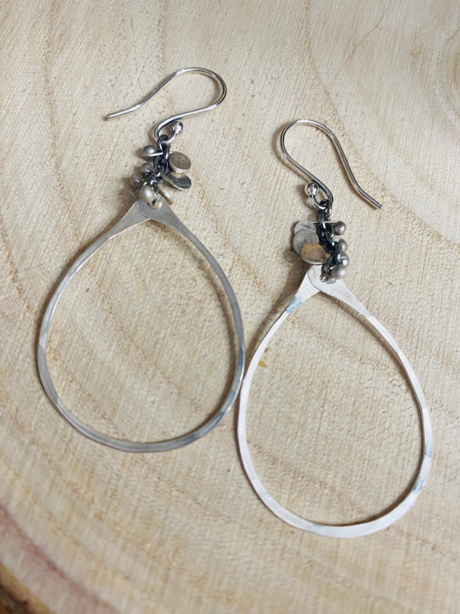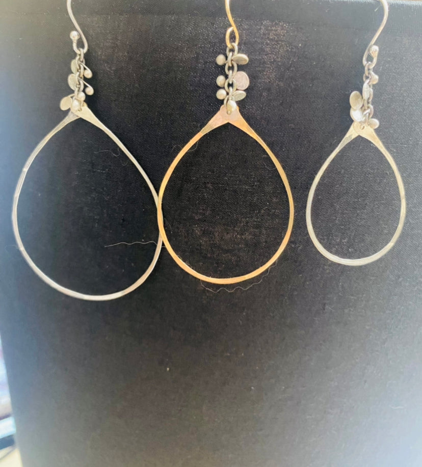 This best seller is presented in the medium size and perfect for so many things! .999 fine silver confetti paillettes topping a finely hammered teardrop hoop.