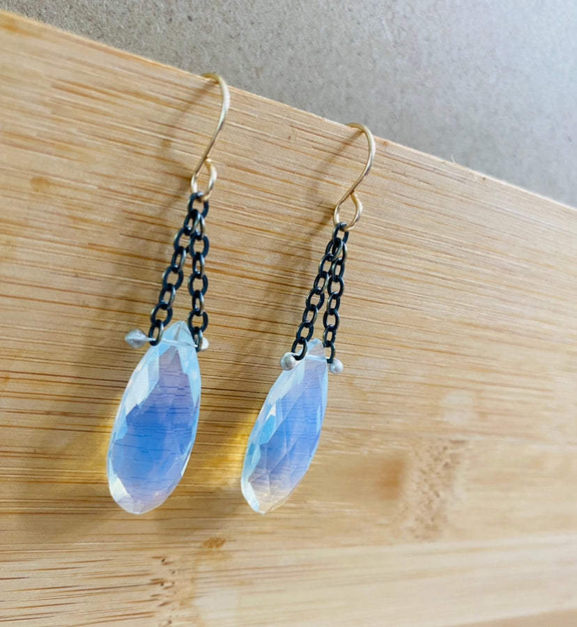 I rarely create with anything other than genuine gemstones but in this case, as with the opalite, I’ll make an exception. Beautiful drops which capture and reflect a span of colors are suspended with fine silver pins from oxidized chain and gold fill ear wires. Can substitute sterling silver ear wires as well.