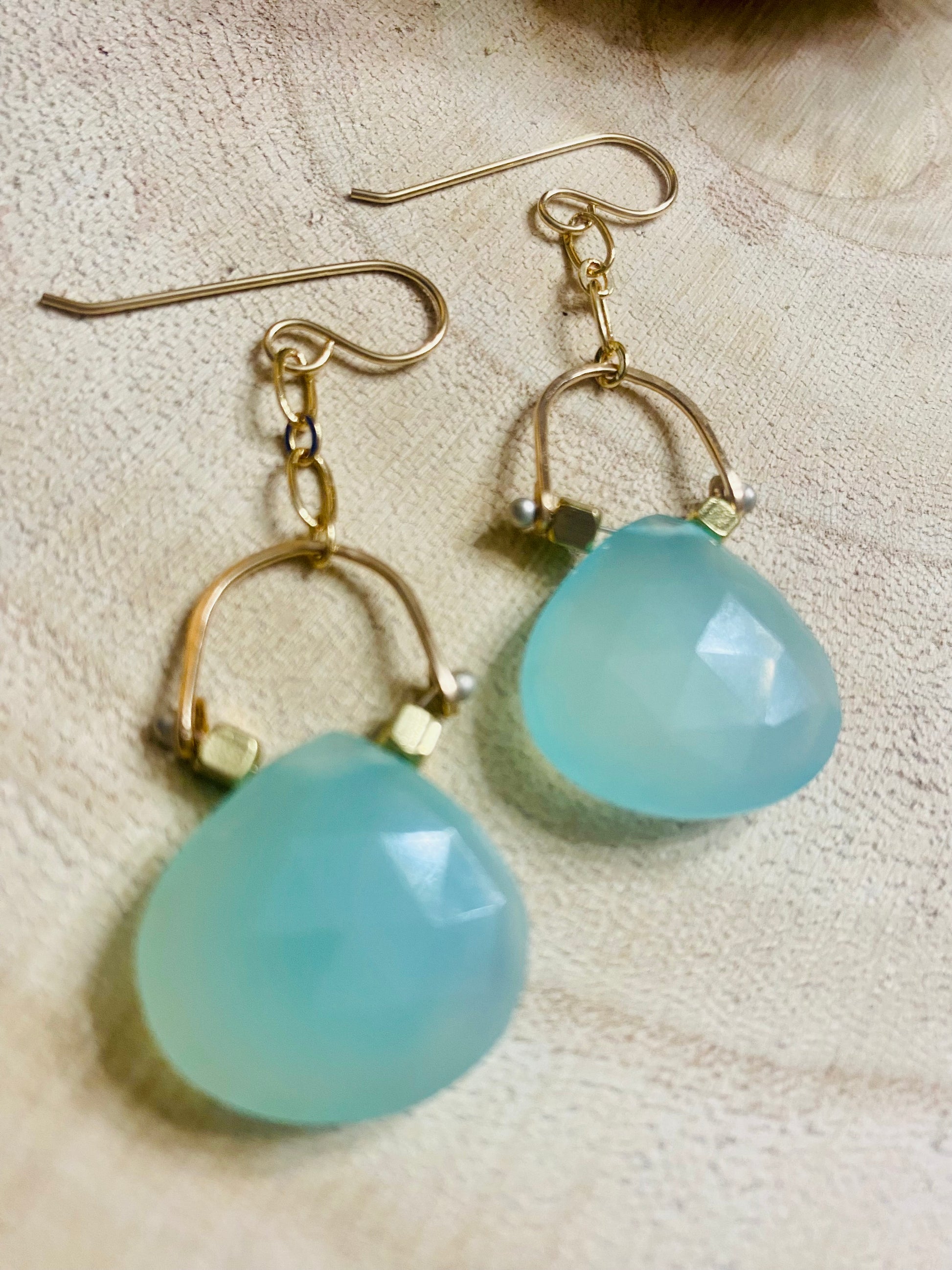 Plump blue chalcedony stones are captured in gold fill stirrups which are suspended from a short chain. Little brass box beads and gold fill ear wires complete the design.