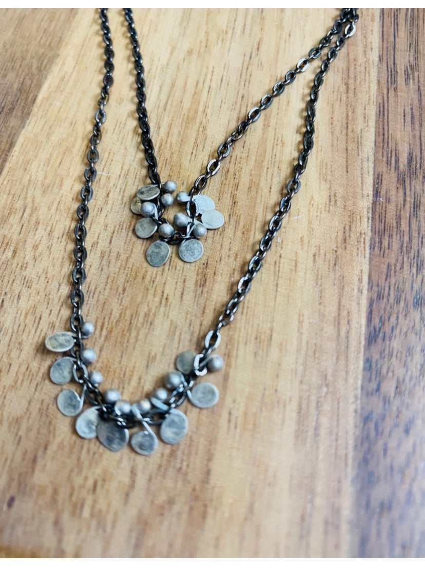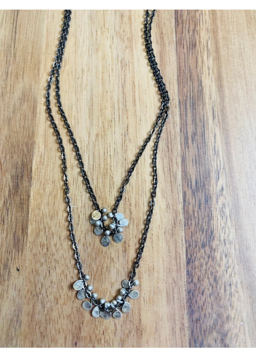 This pretty necklace has double draping chains with gorgeous hand hammered paillettes which resemble pure silver confetti. Wear it anywhere with anything. Shorter chain is 17.5” and longer chain is 19”.