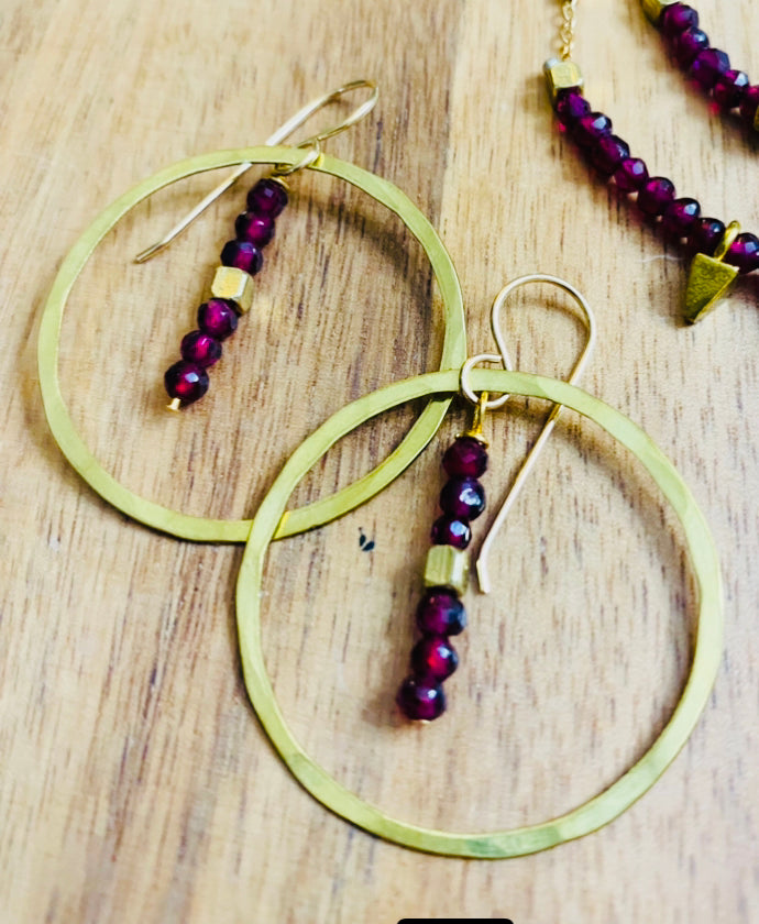 These fun hoops are crafted with 1.5” brass hoops with a line-up of little garnet rondelles for a great swinging look. Gold fill French ear wires finish the look.