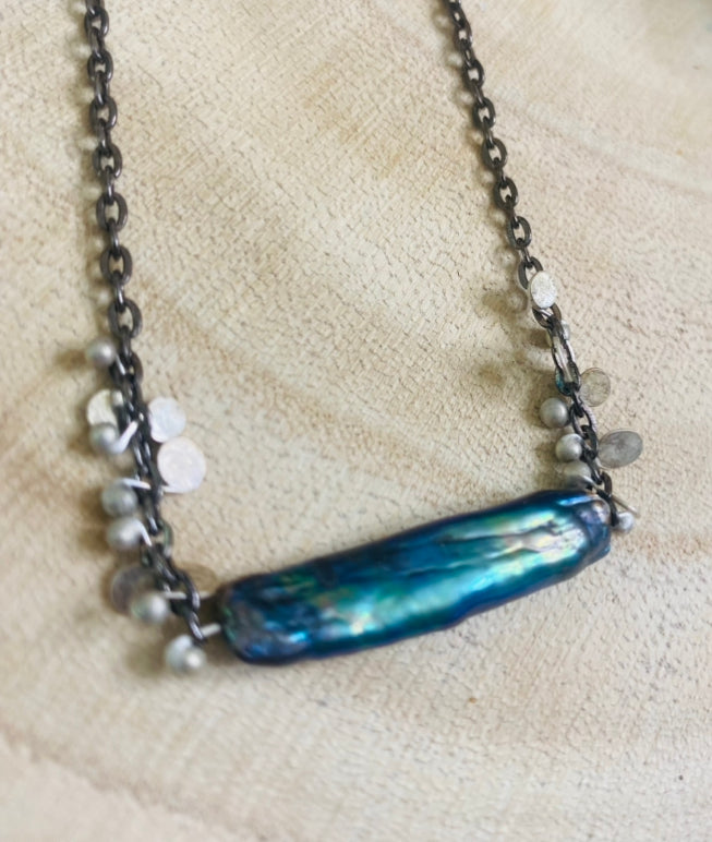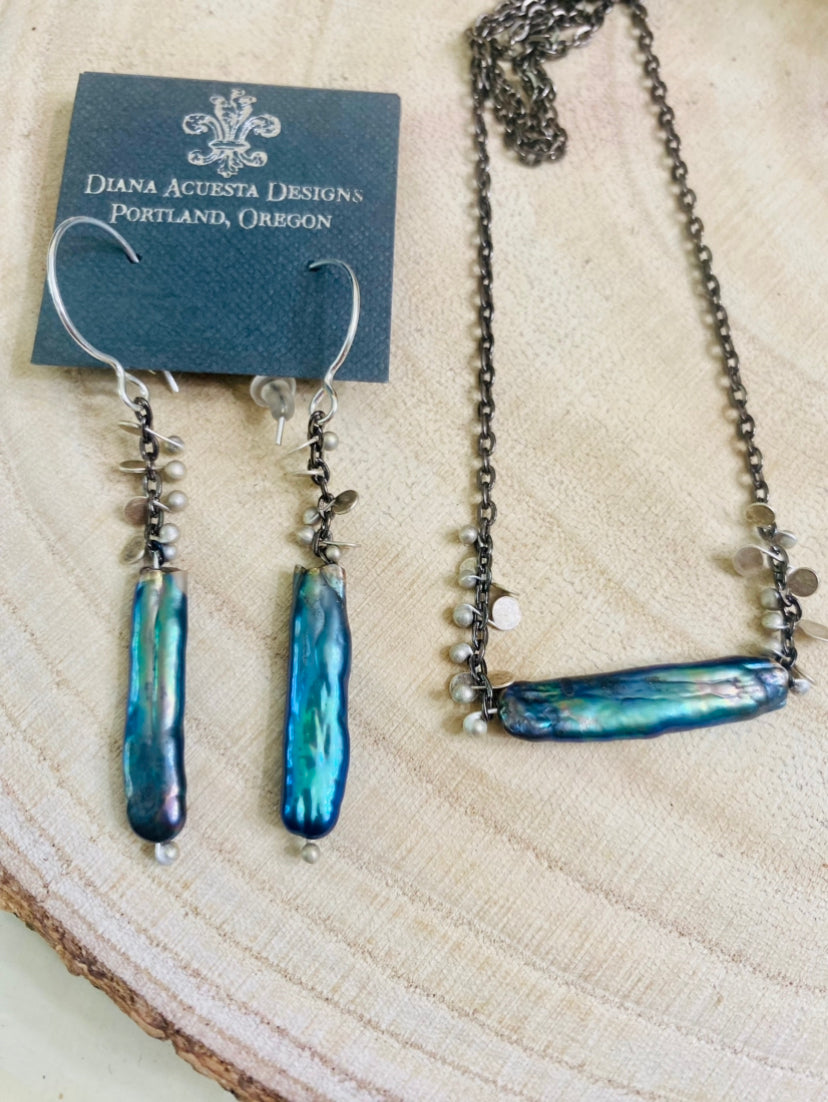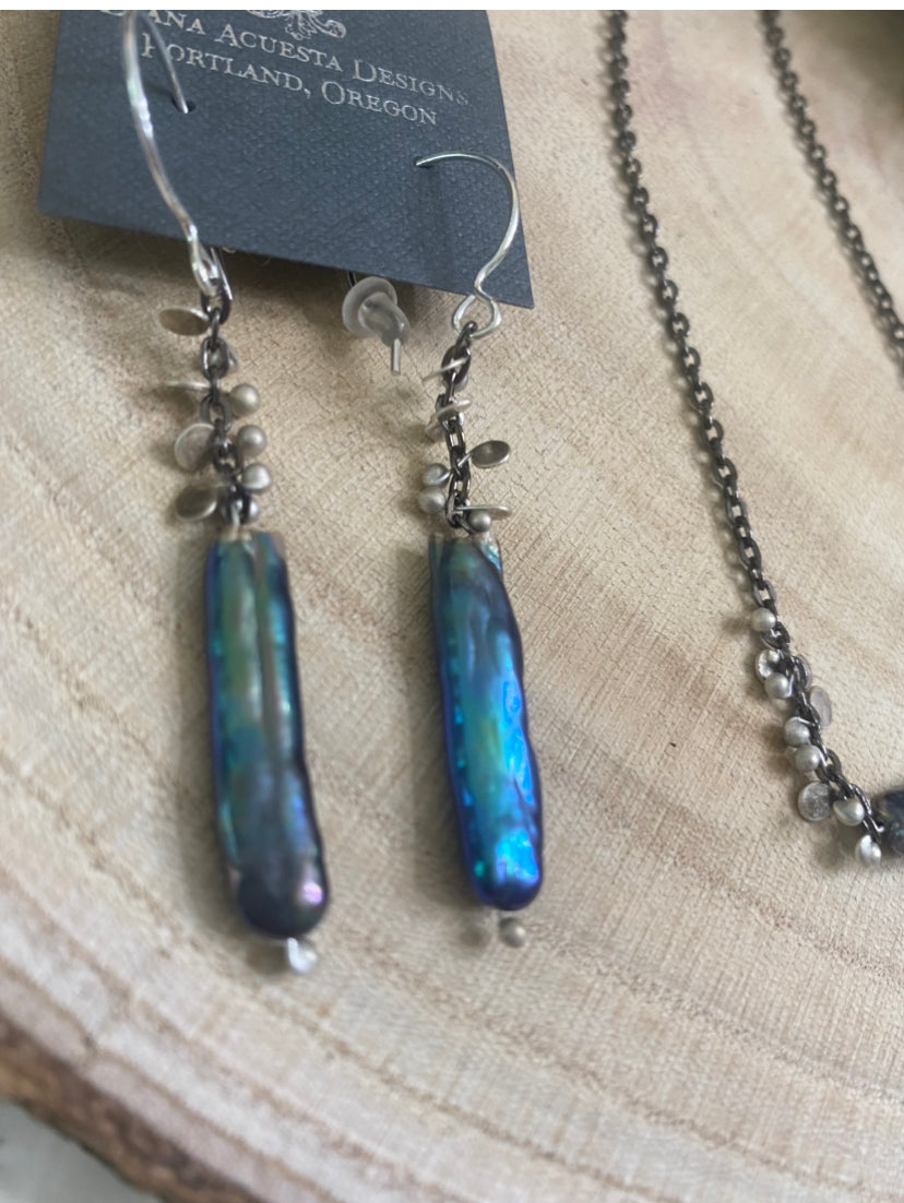 Glossy Peacock Biwa Pearl Earrings with Fine Silver Metal Work