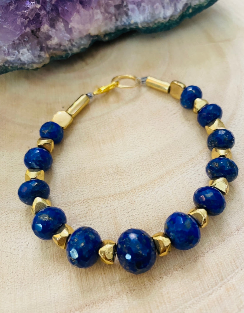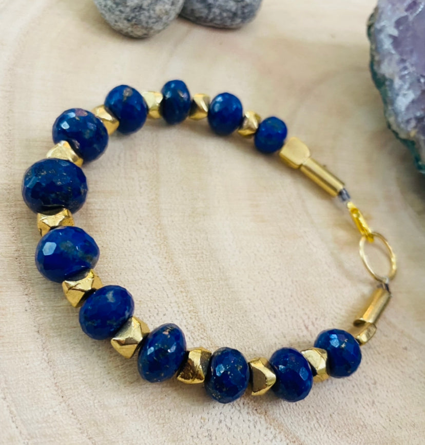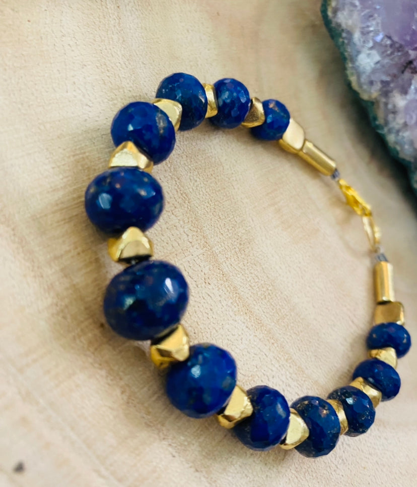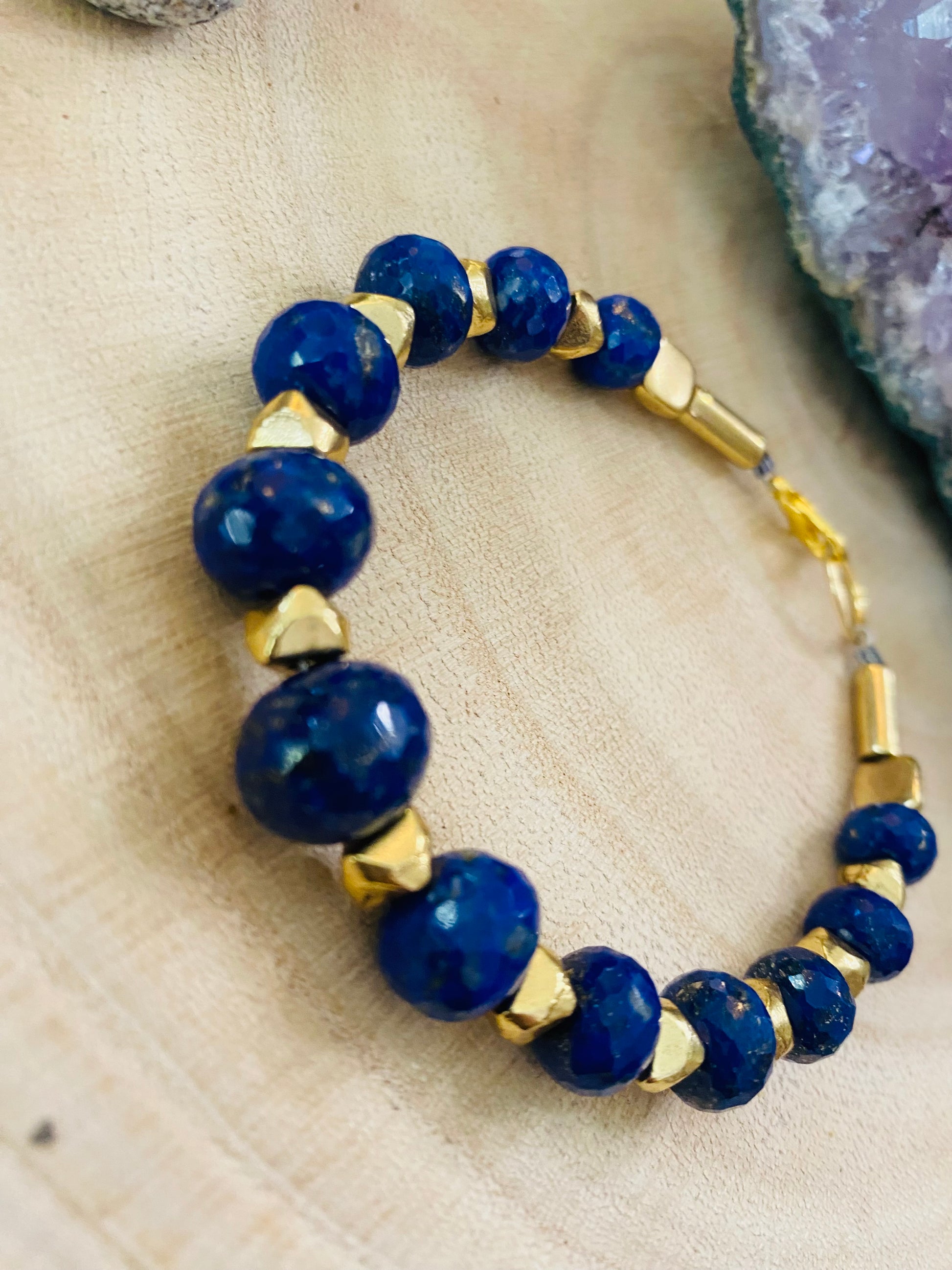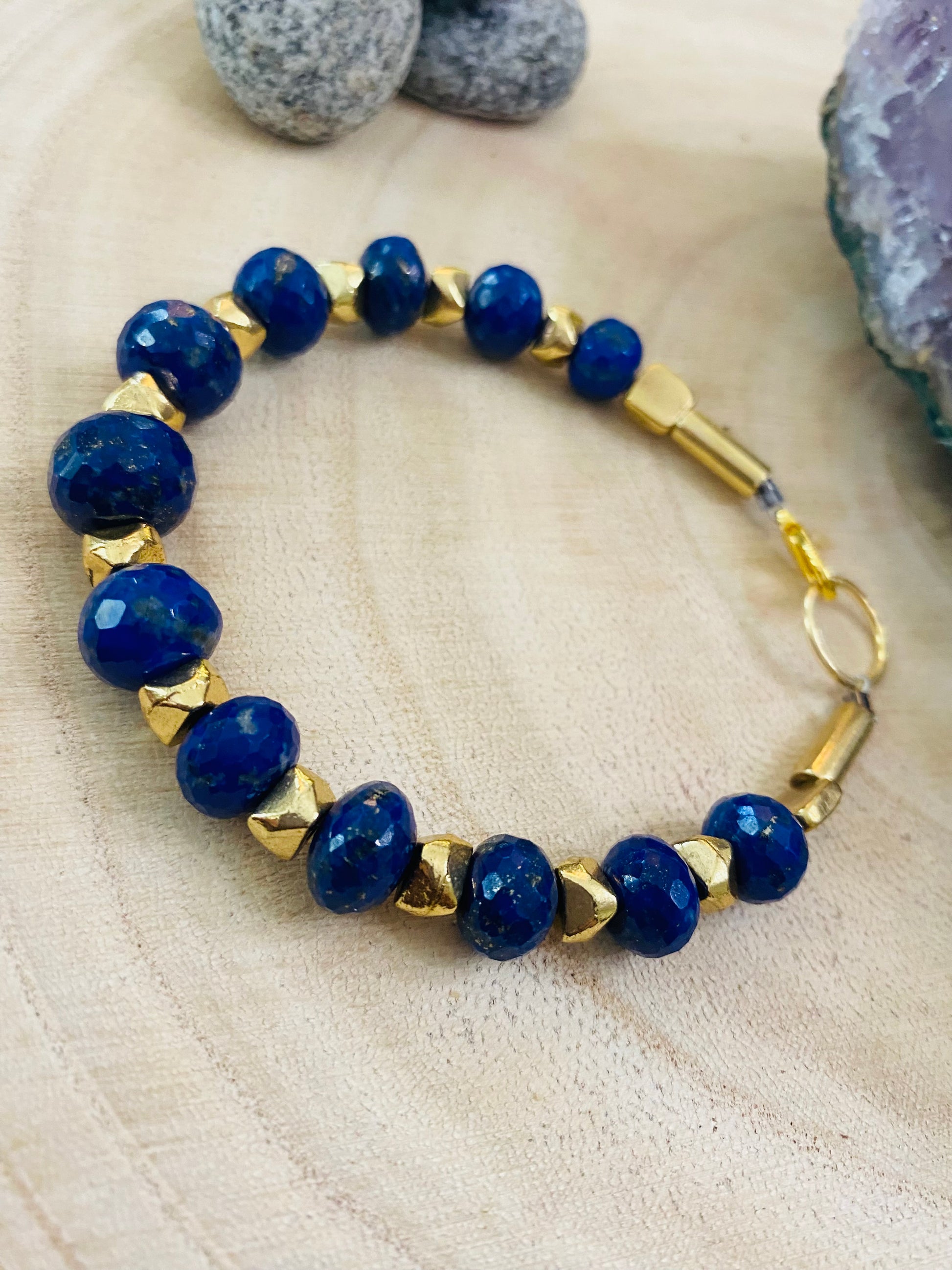 Amazing cobalt blue lapis rounds scaled in smaller to larger sized rounds. Plump, juicy gems supported by golden brass spacers. One of a kind. 7.5” length but can be further sized upon request.