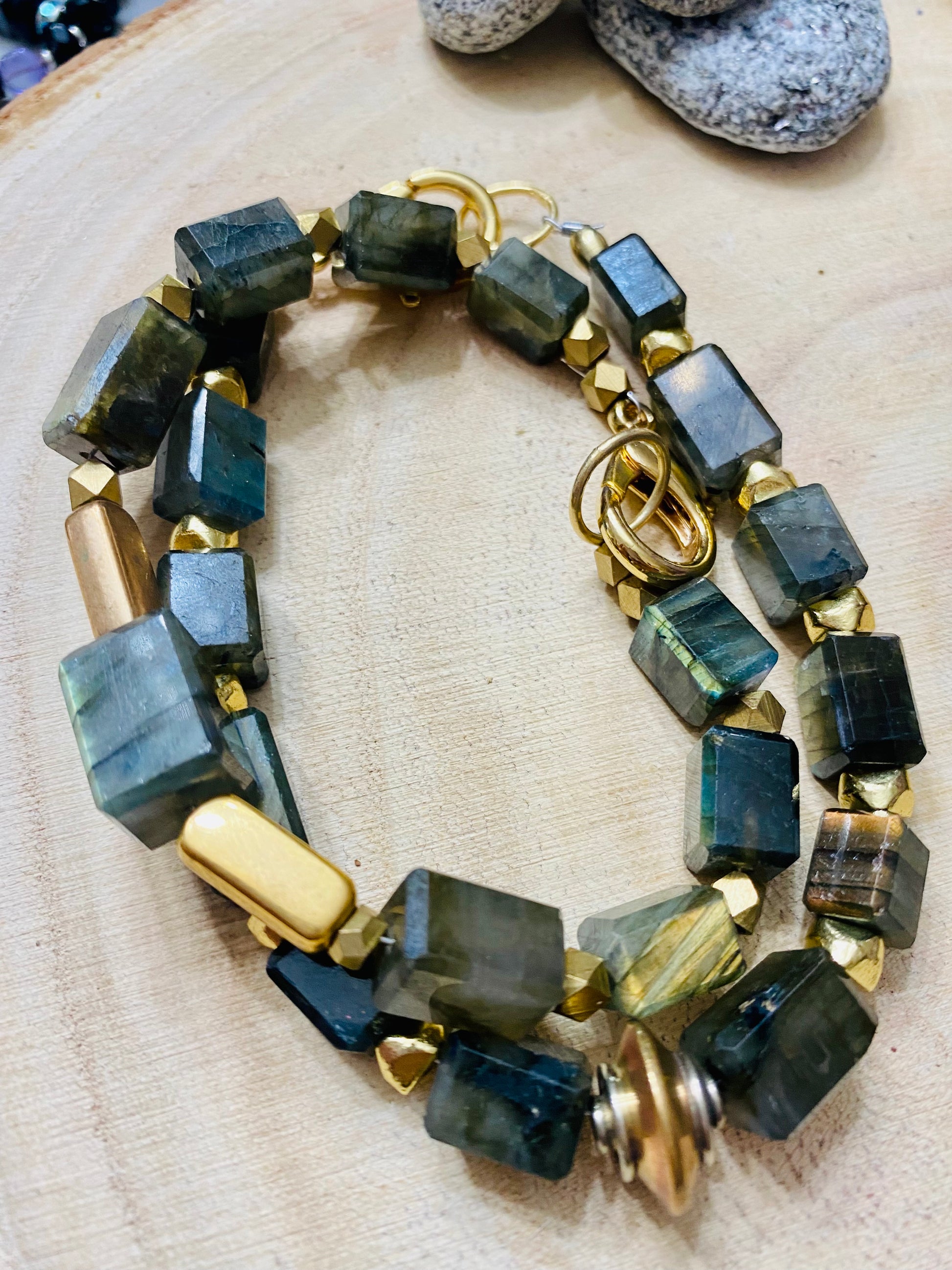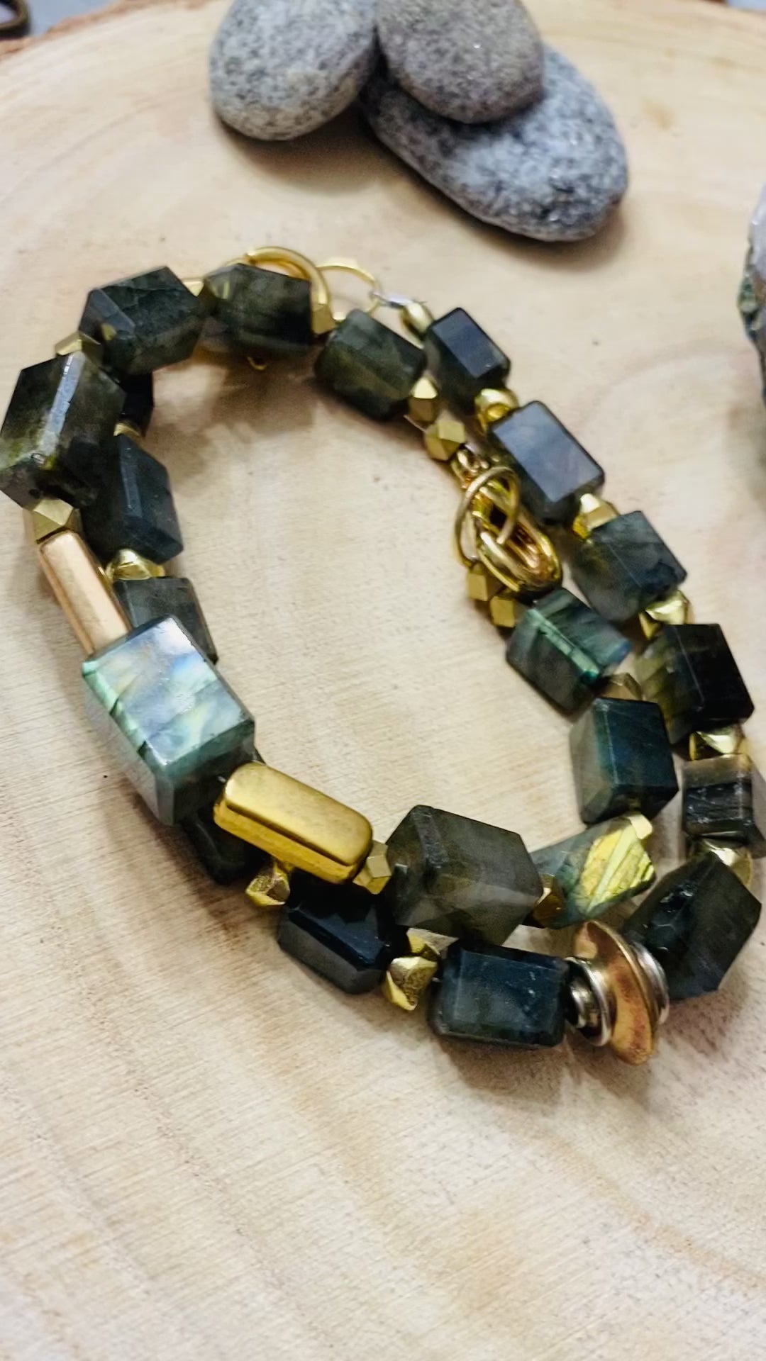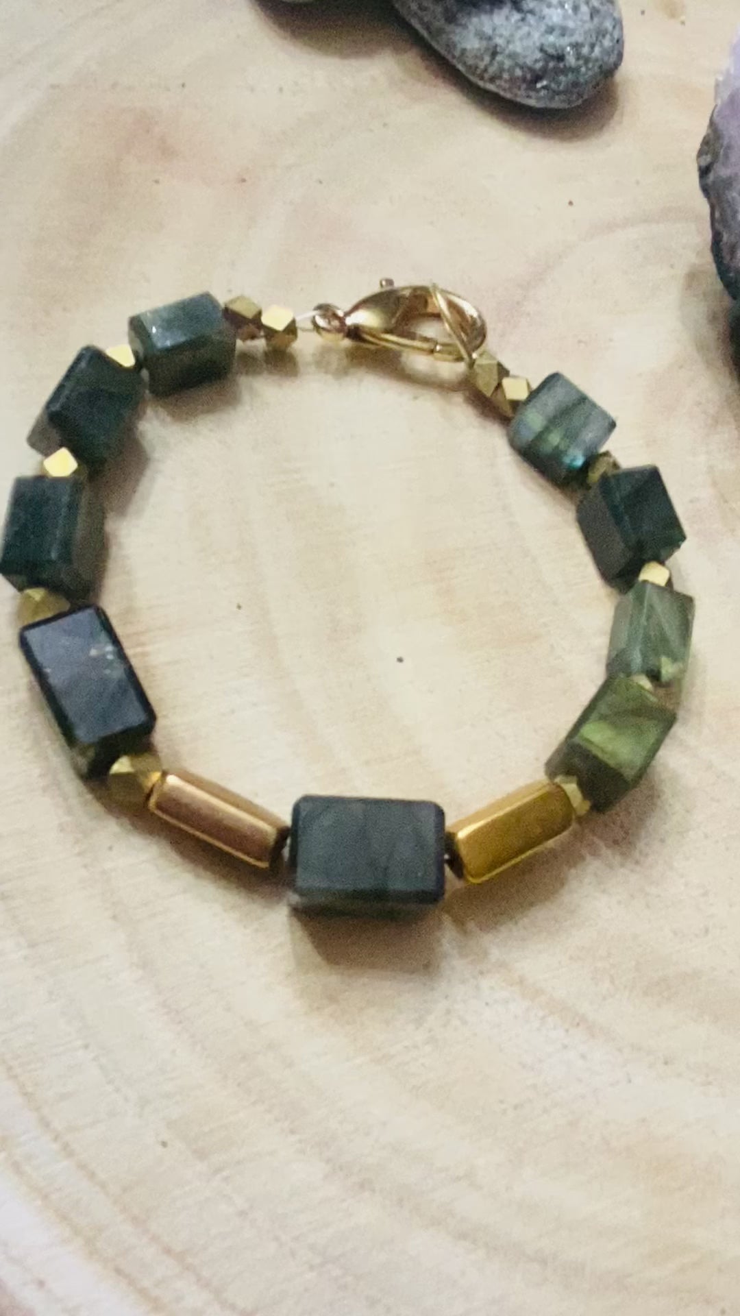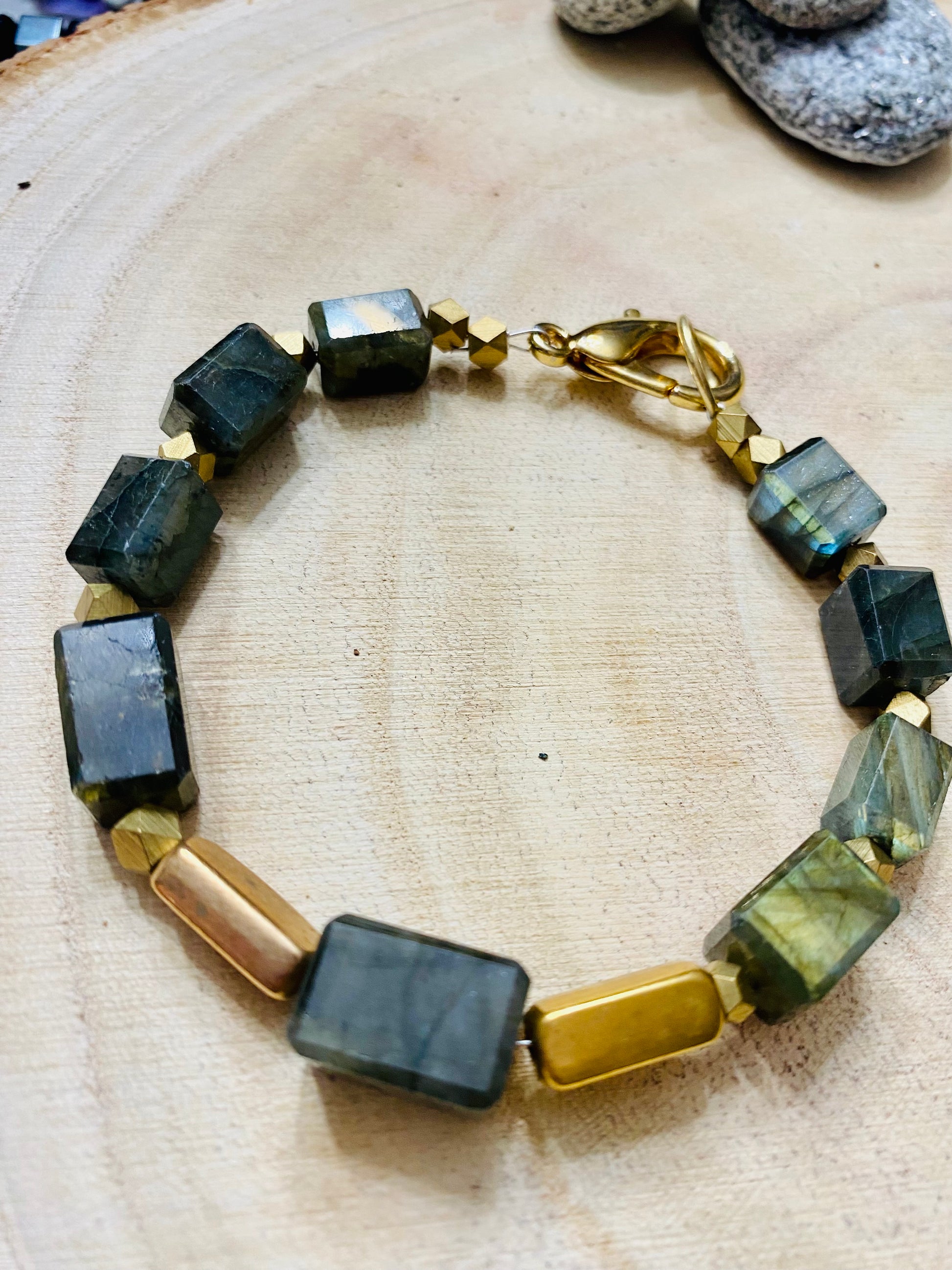 Extremely limited edition Men’s labradorite bracelet with brass findings and a large size lobster claw clasp for easy on and off - not that you’d ever want to take it off! These generously sized stones are on fire!!! They flash blue and green and gold and come alive under virtually every light source.
