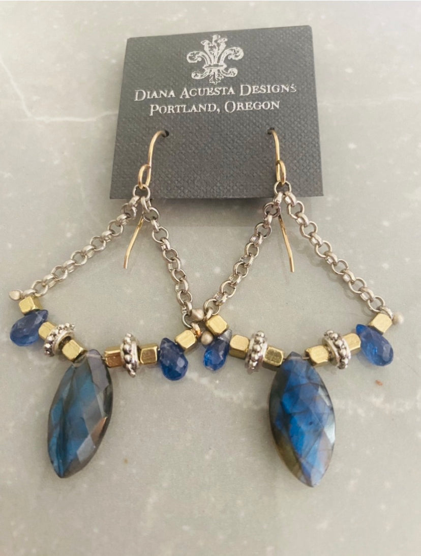 Marquis cut labradorite stones with flashy blue shimmers surrounded by blue kyanite drops to either side suspended from silver rolo chain. Really beautiful color combination.
