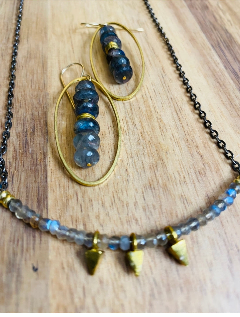 This sparkly labradorite necklace is a perfect layering piece. Sparkly lab rondelles capture 3 little brass arrows for a sharp design. Looks great in both 18” and 30” versions.