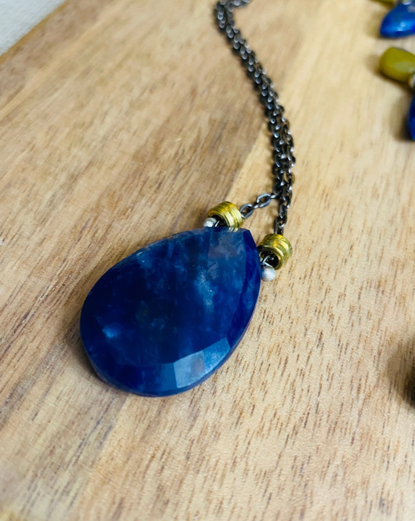 Rich royal blue lapis teardrop necklace on oxidized chain with little brass beads on either side. Perfect for layering at 30” or can he sized down upon request.