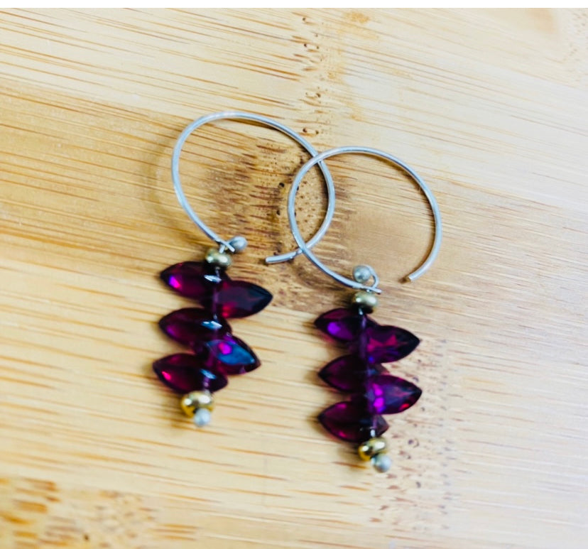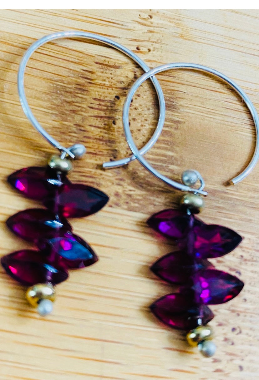 These berry hued marquis cut rhodolite garnet earrings are loaded with amazing deep magenta color. These are on the petite side with a 1” hoop and approx 1/2” drop of gems. These very high quality stones are beautifully cut.