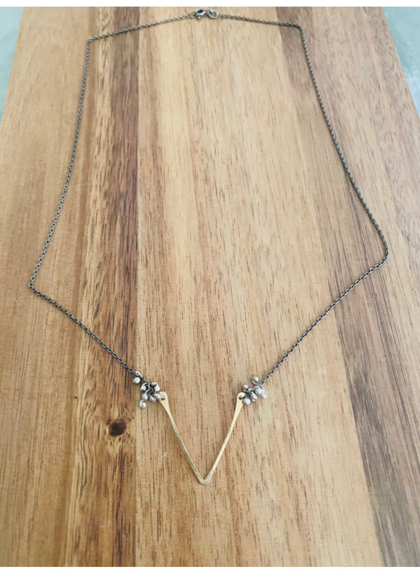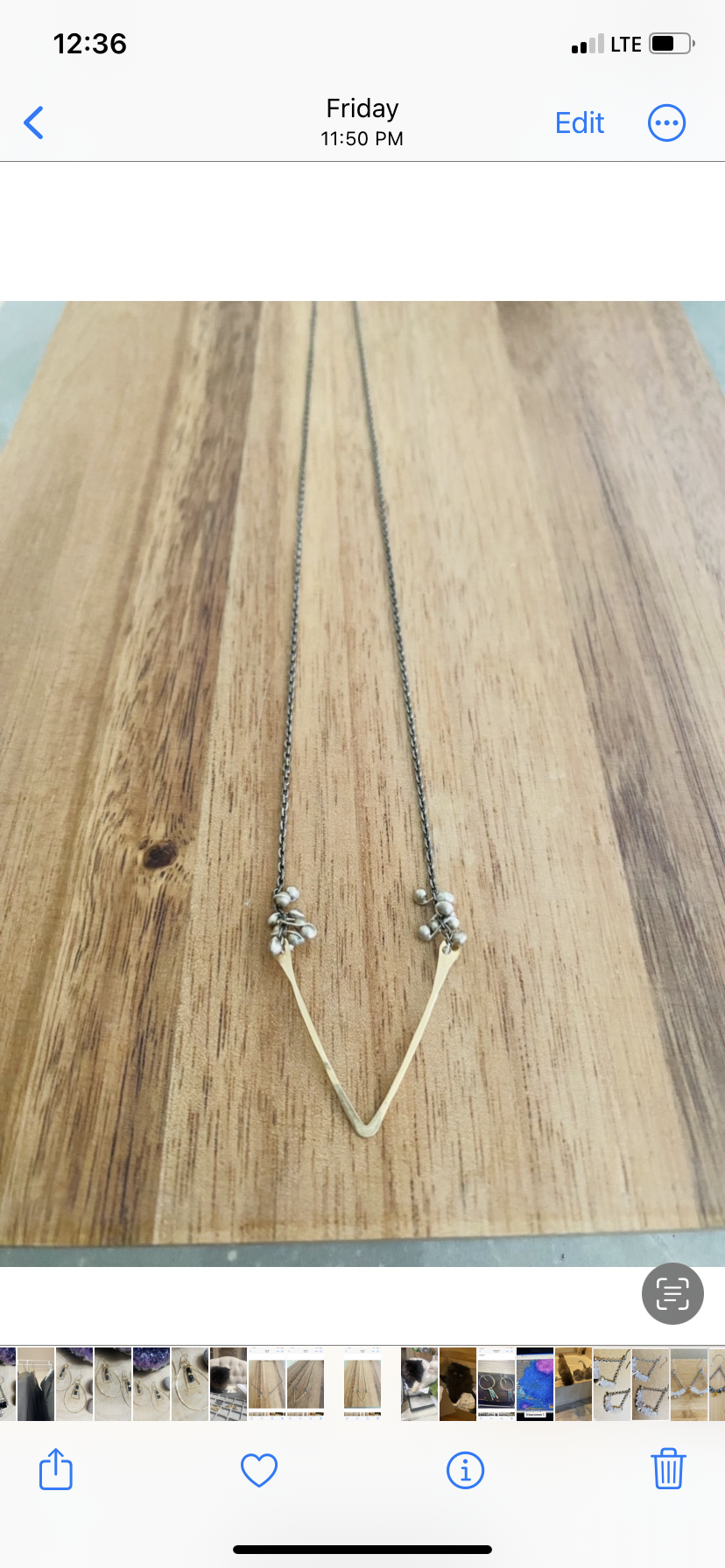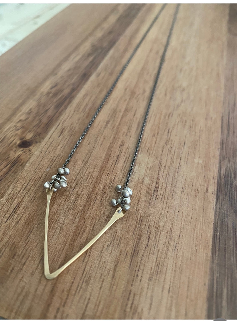 Perfect little necklace on its own or layered. A small gold fill “V” with .999 fine silver balls fired through the chain with a torch. Oxidized silver chain. 18”