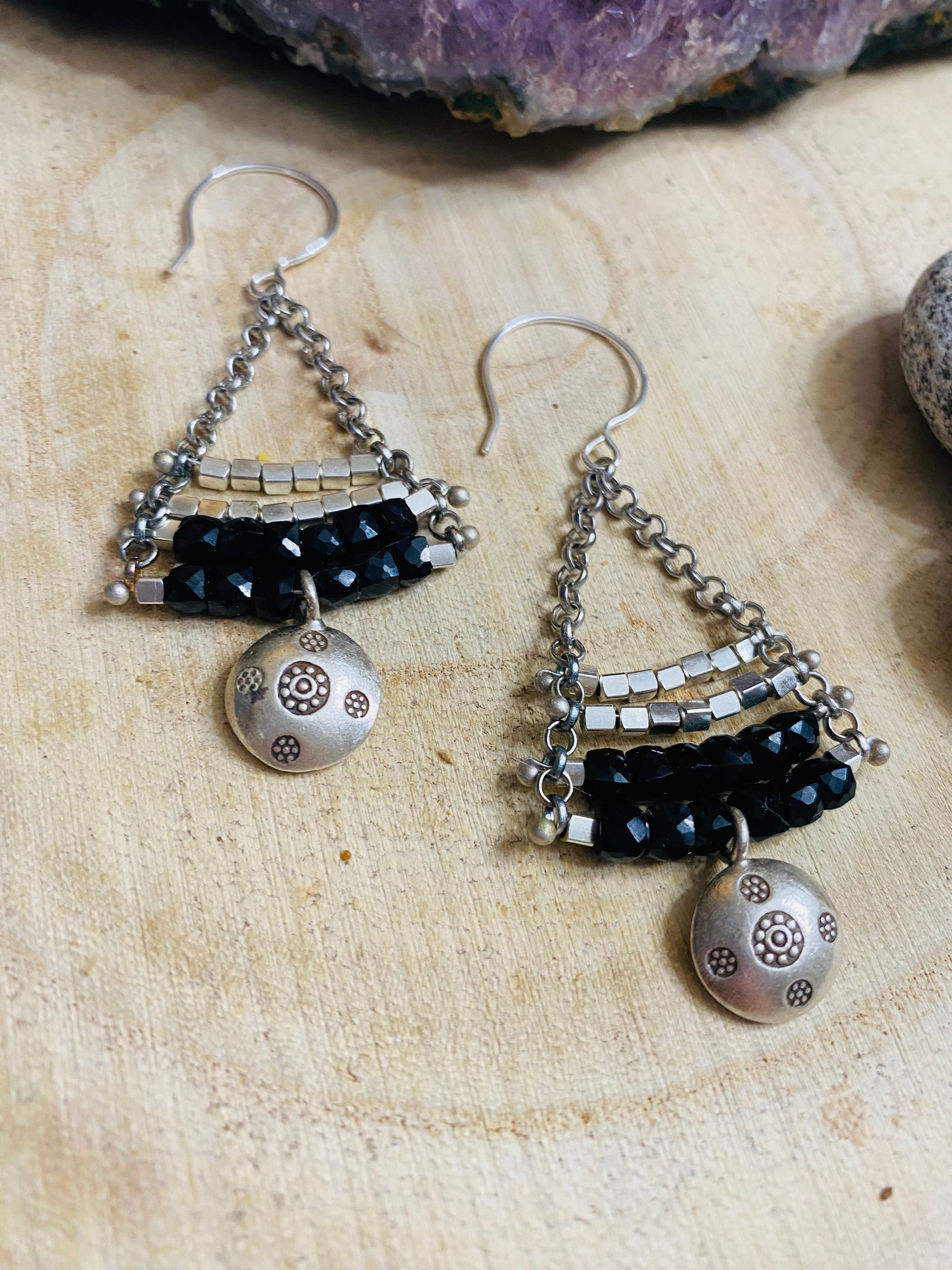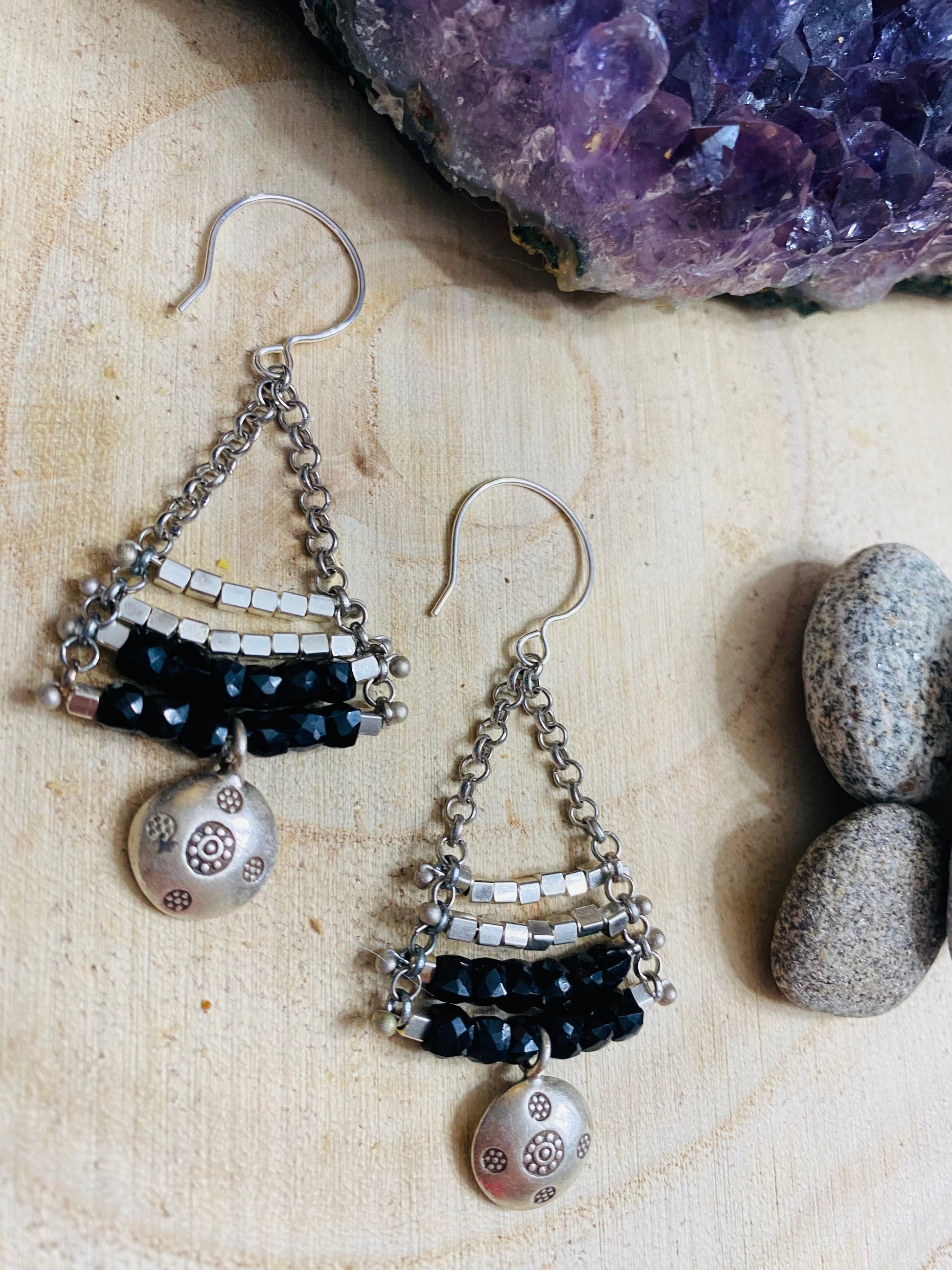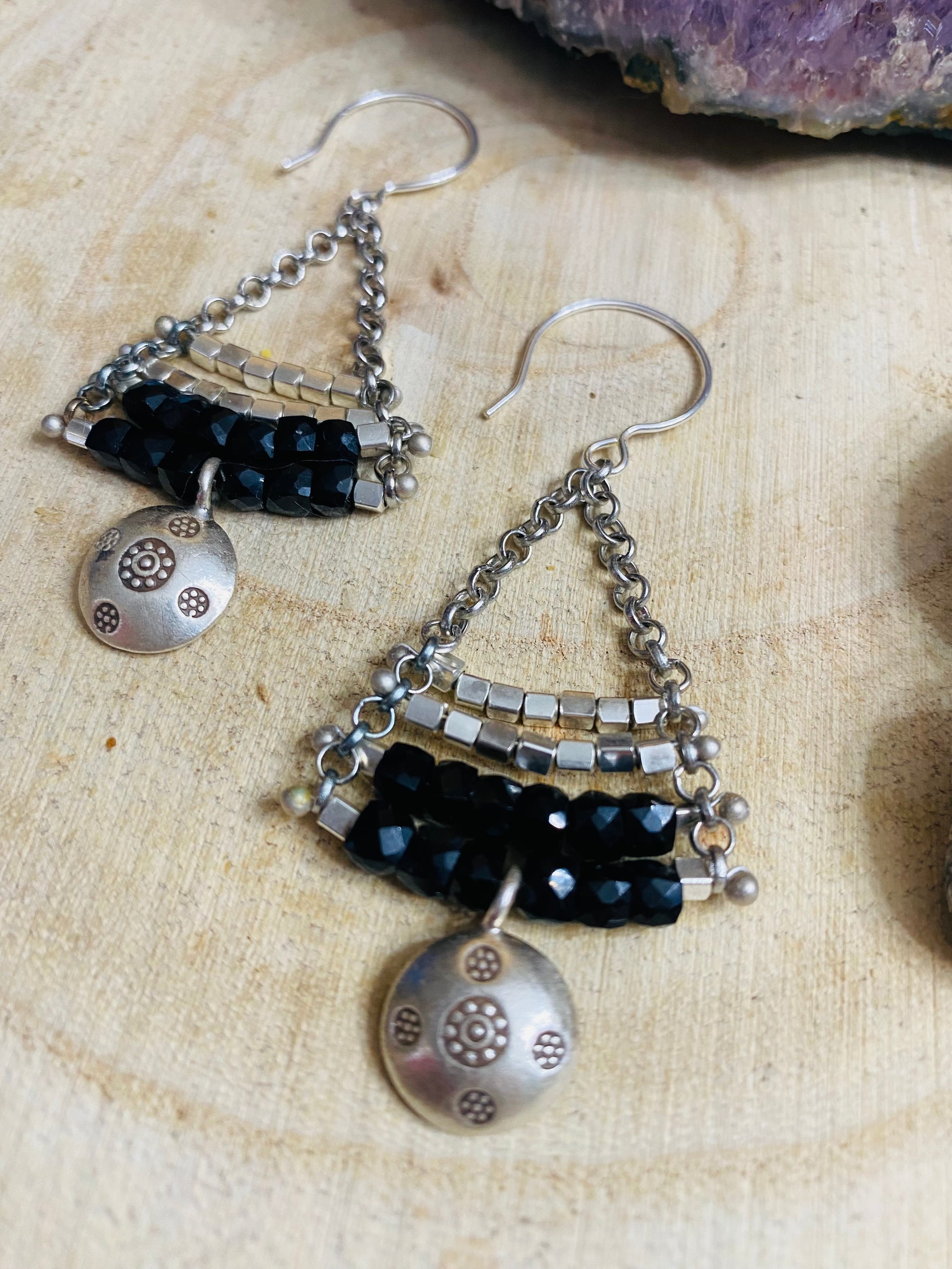Sultry swings of faceted box cut onyx gems matched with tiny silver boxes and Bali silver drops.