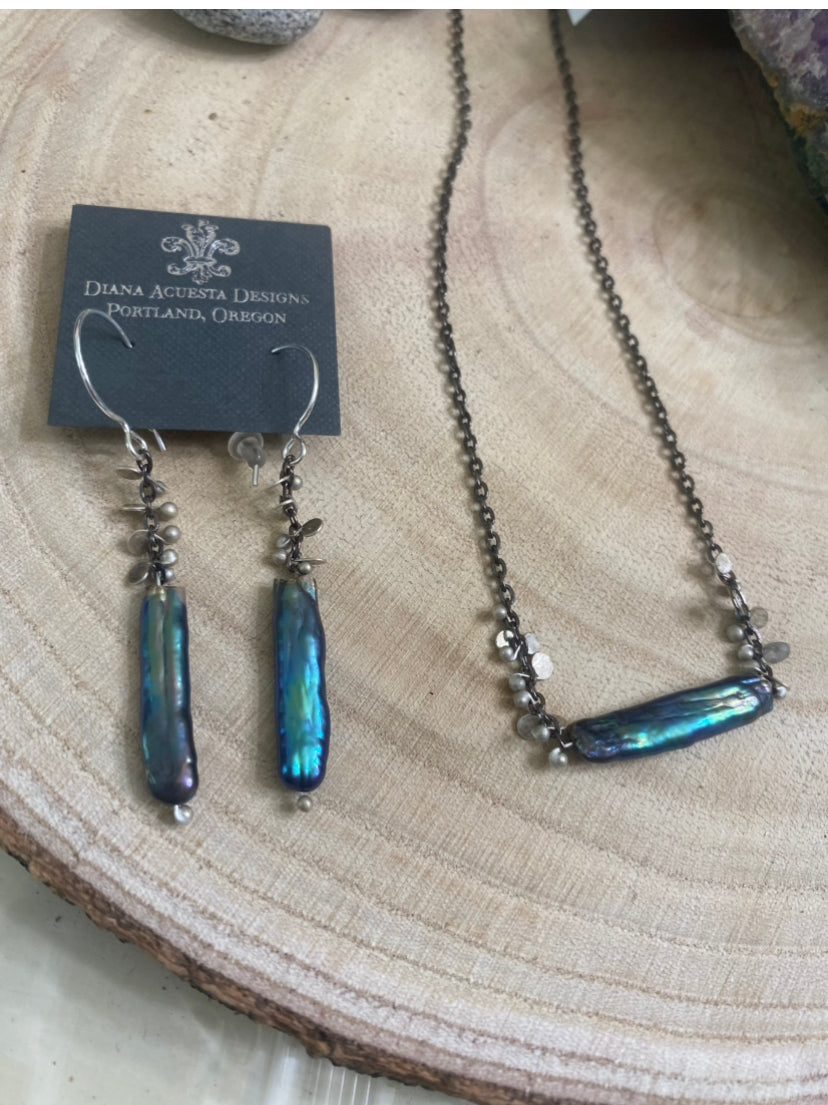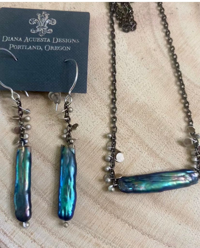 Glossy, exceptionally colorful Biwa Pearl necklace in vibrant peacock tones finished with hammered fine silver confetti paillettes on either side. 18” oxidized silver chain.
