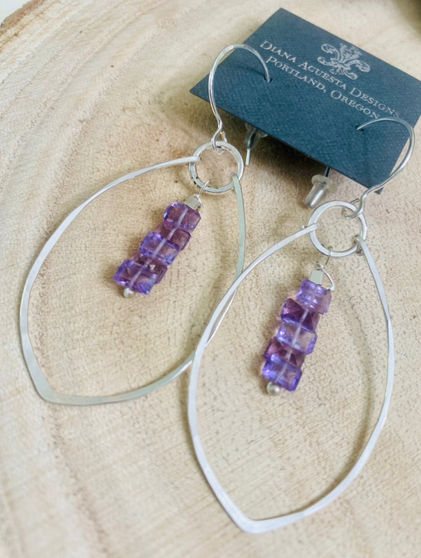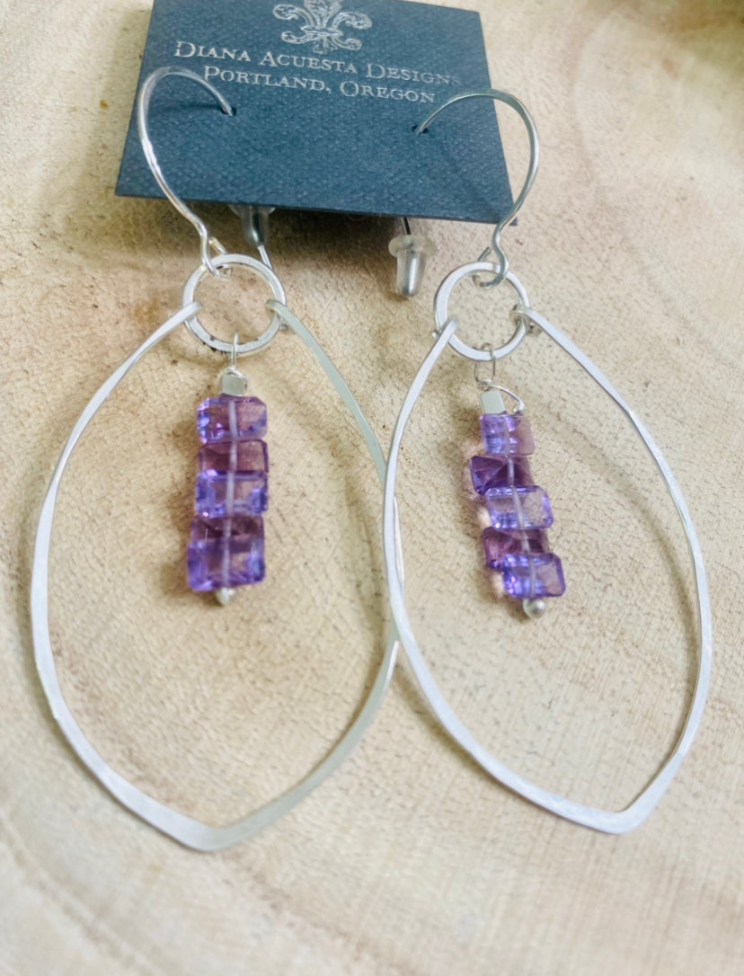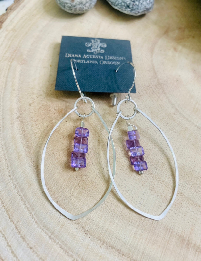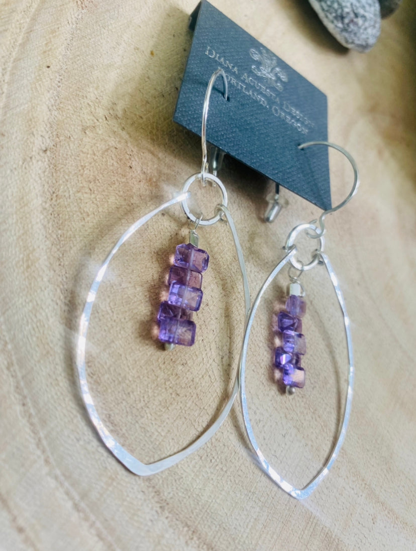 These pretty little earrings are hammered out leaves with a gorgeous inside drop of emerald cut amethysts. So simple and pretty!