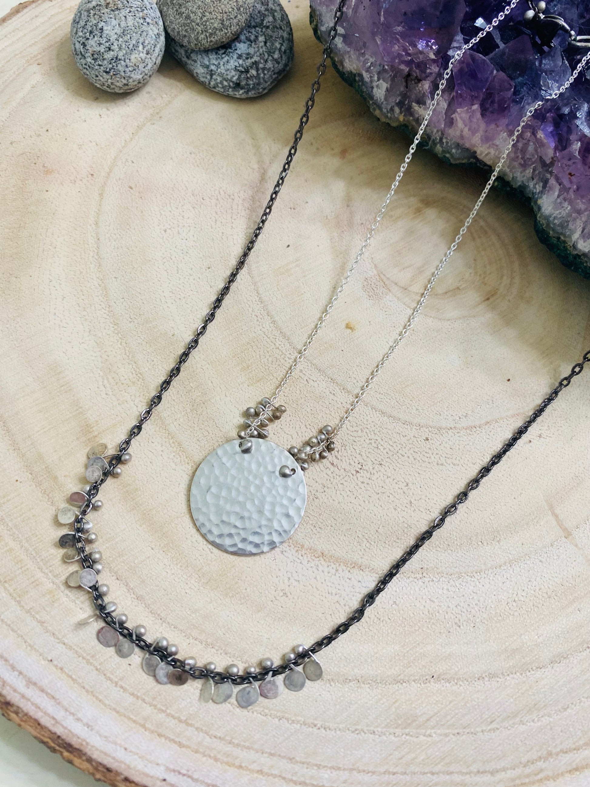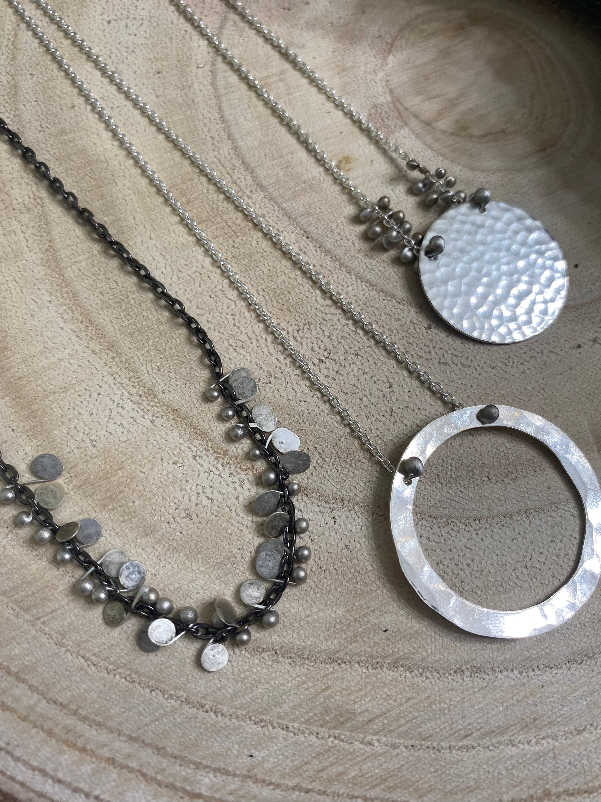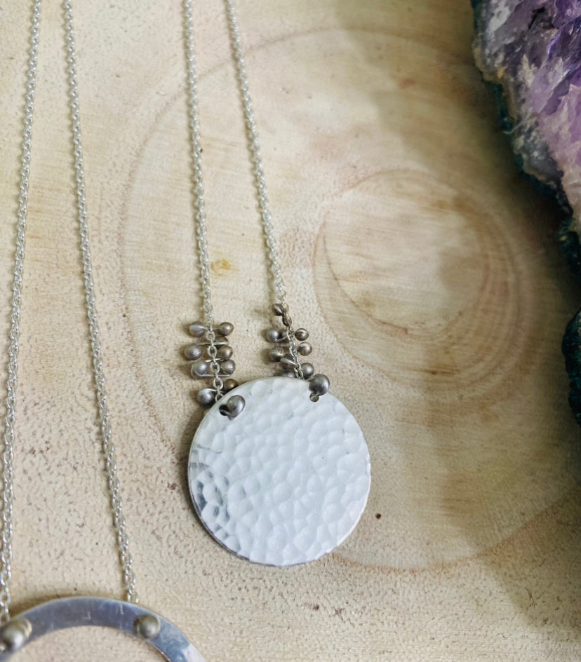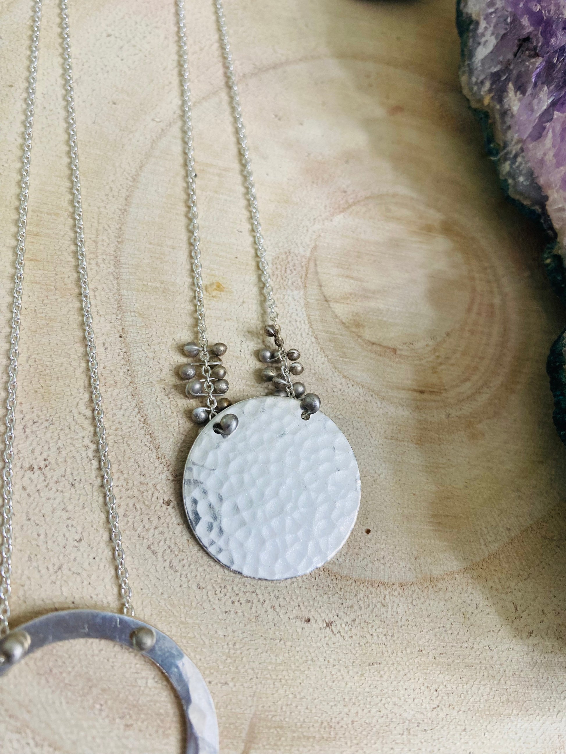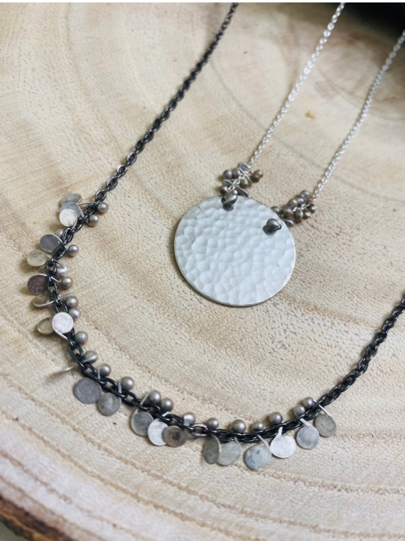 This sweet necklace features a hand hammered 3/4” disc flanked by hand torched fine silver caviar metal work. Simple with a tiny bit of edge…18” length.
