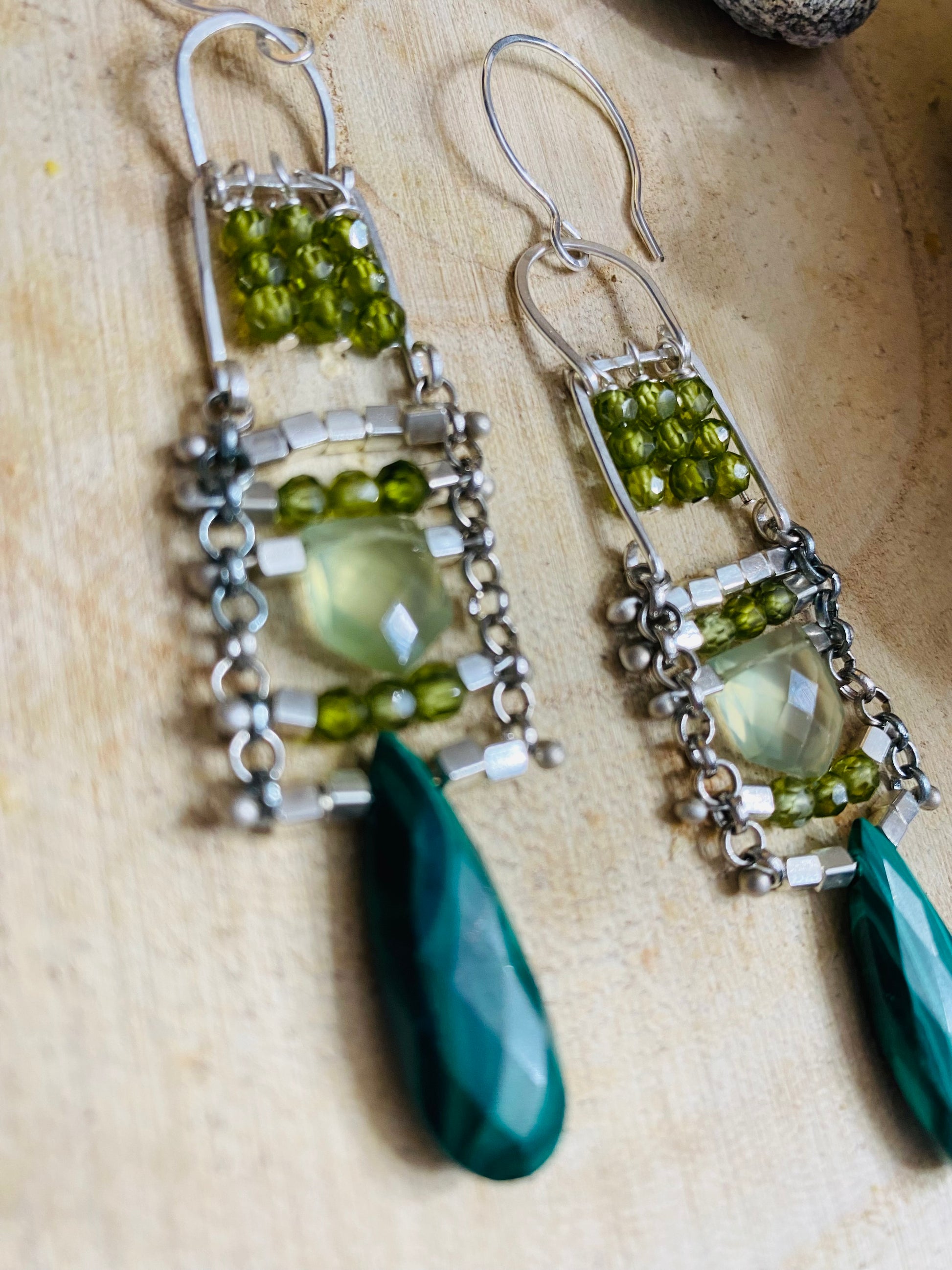One of our unique earring layouts features these verdant green malachite briolettes dangling from a matrix of olivine CZs, teeny silver boxes and shield-cut African prehnite gemstones. You will command the room in these stunners! Drop is 2-3/4” from bottom of sterling french wire.