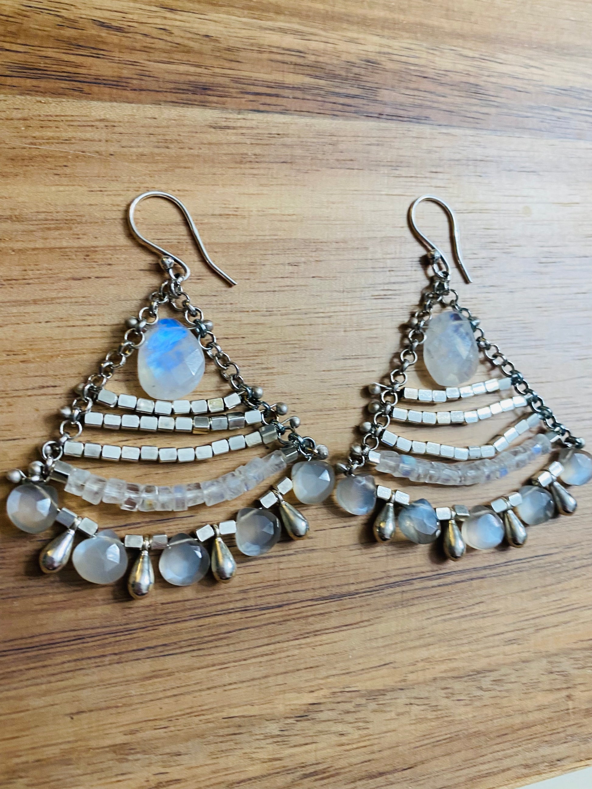 Subtle luxury at its finest. Precious moonstone laden chandelier earrings. Beautiful slices of faceted moonstone cascade with rows of silver beads and glowing moonstone rounds capped by grey moonstone briolettes at the bottom. Sterling silver French wires. Drop is 2.25” from bottom of ear wire.
